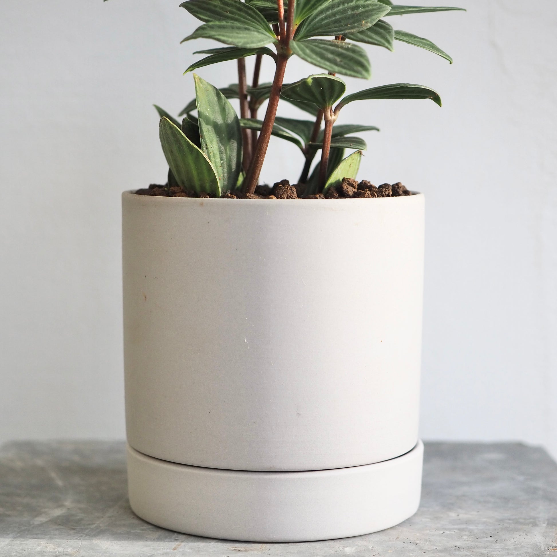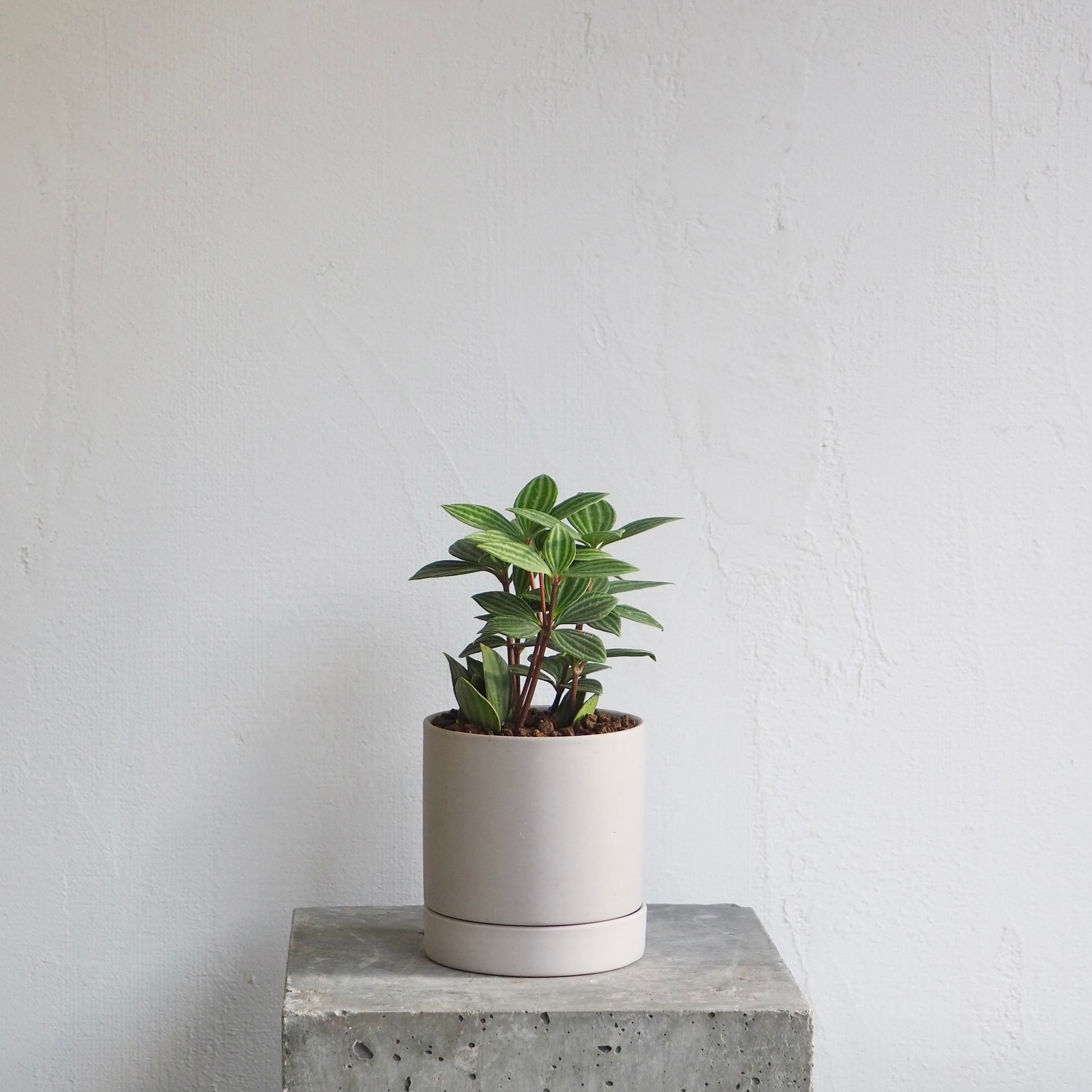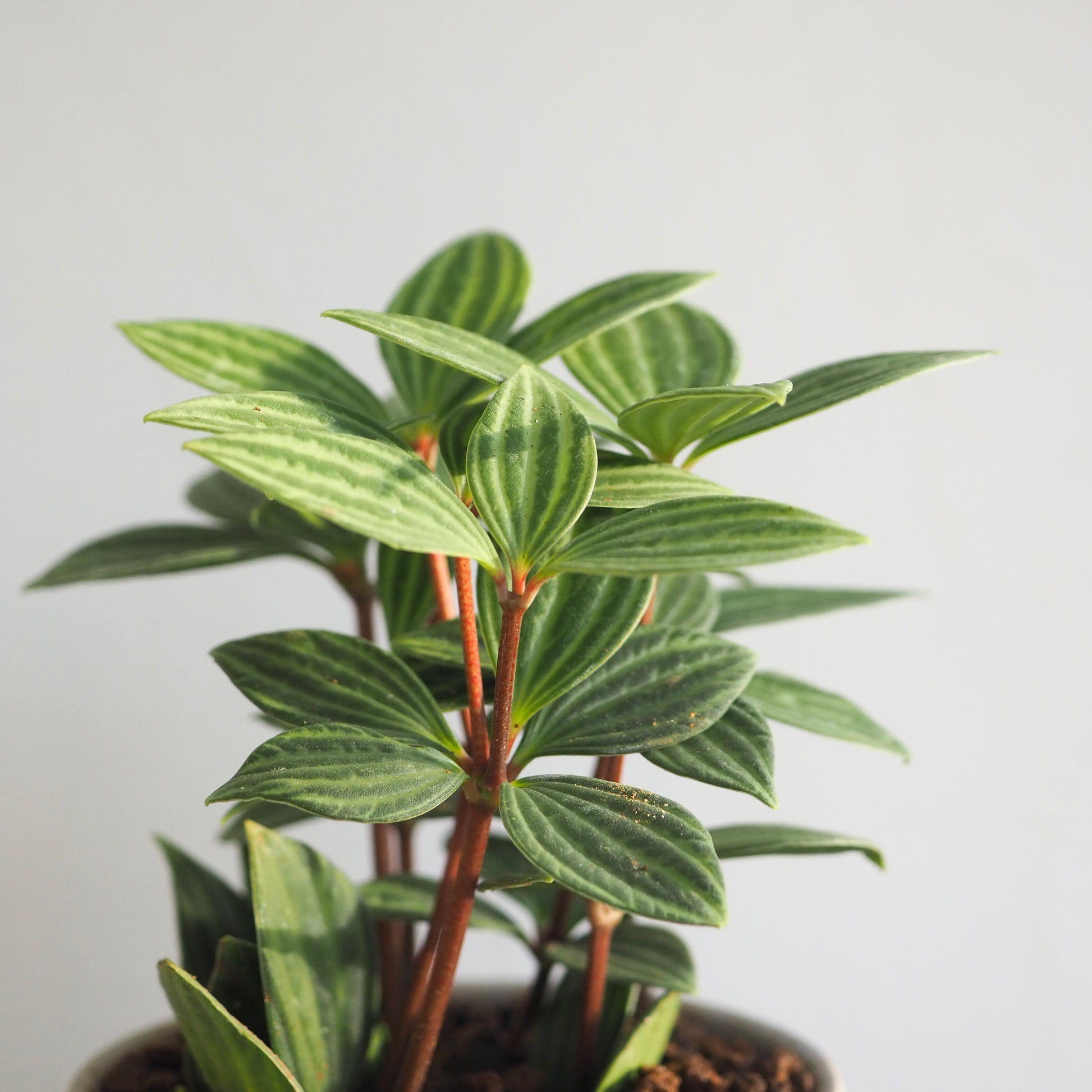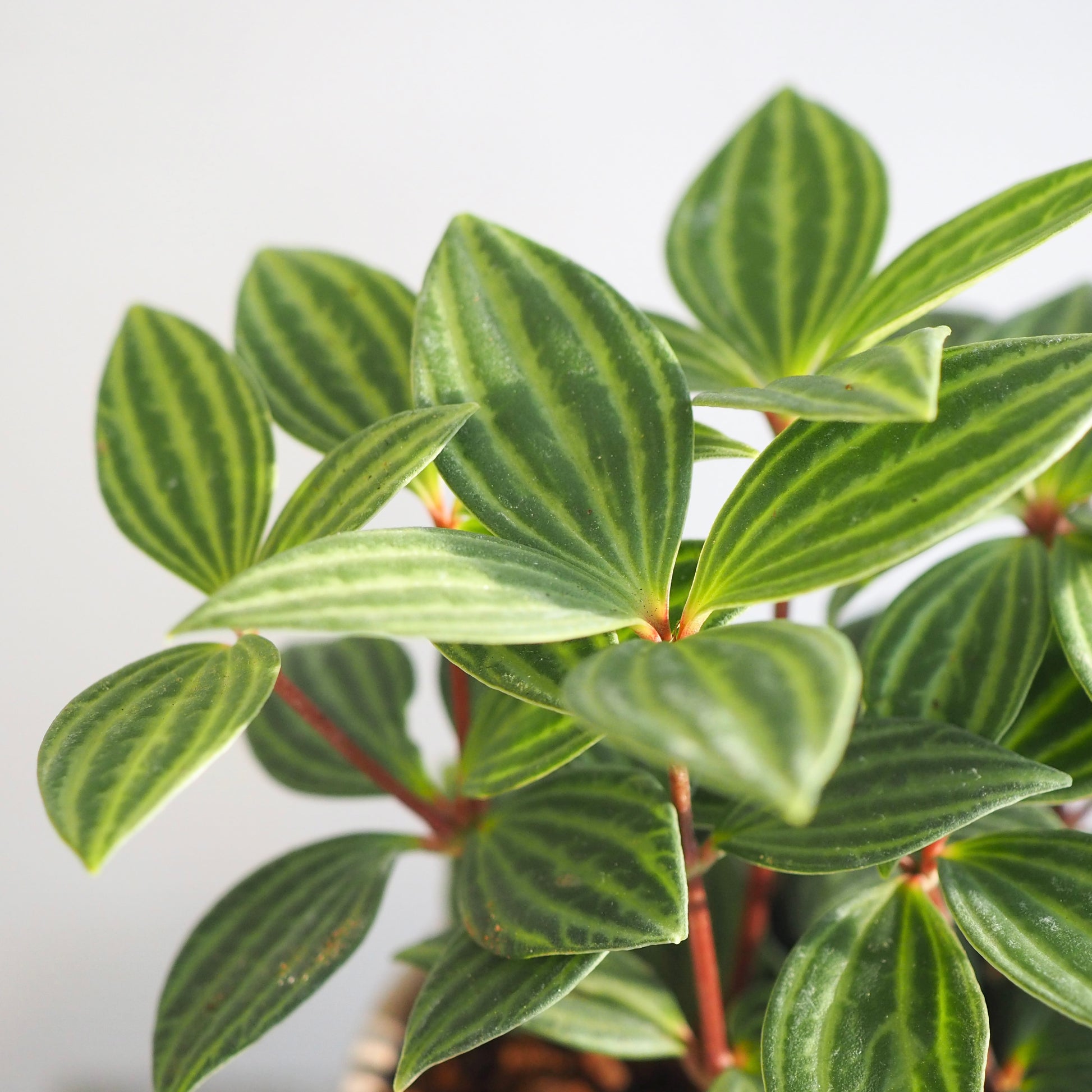 細長く伸びる葉に、濃淡のストライプが走るペペロミア・プテオクラータ。