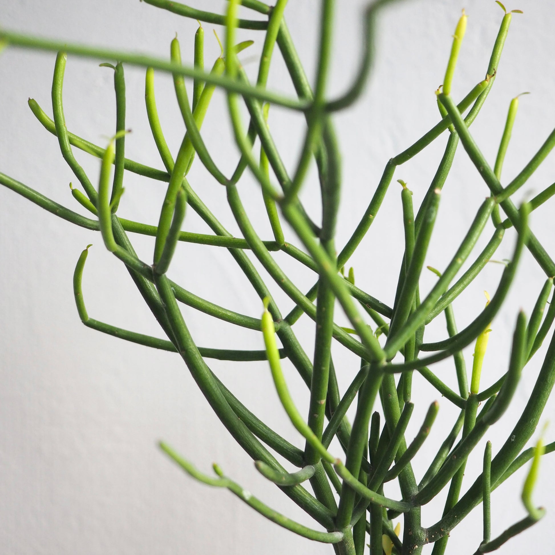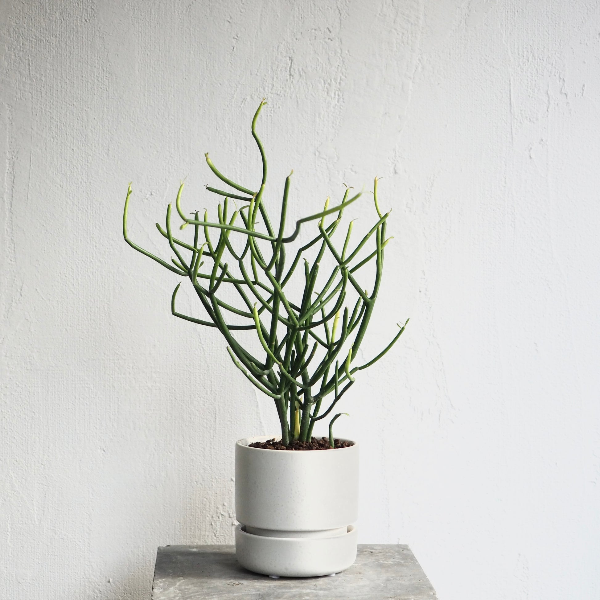 無数の細い枝が空に向かって伸びる、ミニマルで彫刻的なシルエット。ユーフォルビア・ティルカリは、通称「ミルクブッシュ」とも呼ばれる、乾いた美しさを宿した多肉植物です。