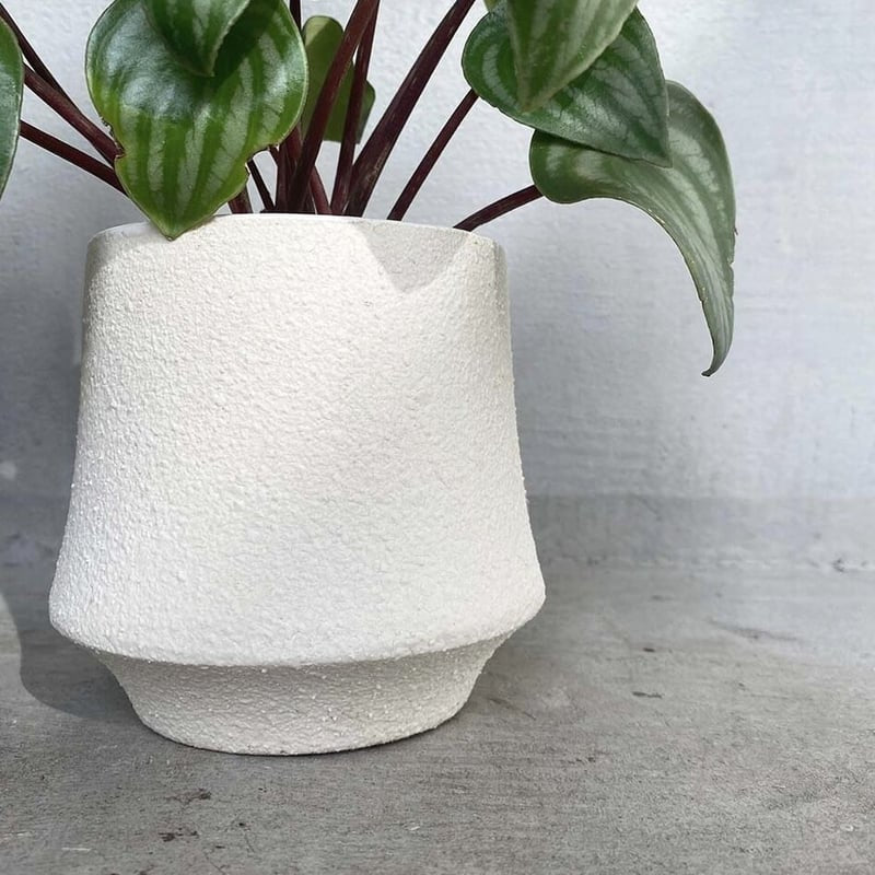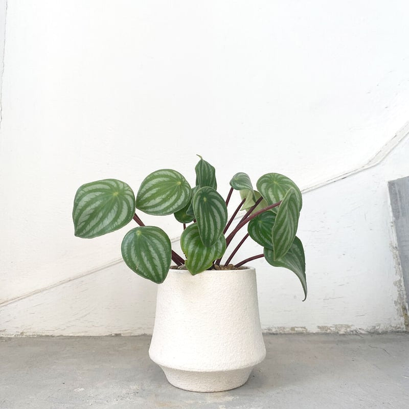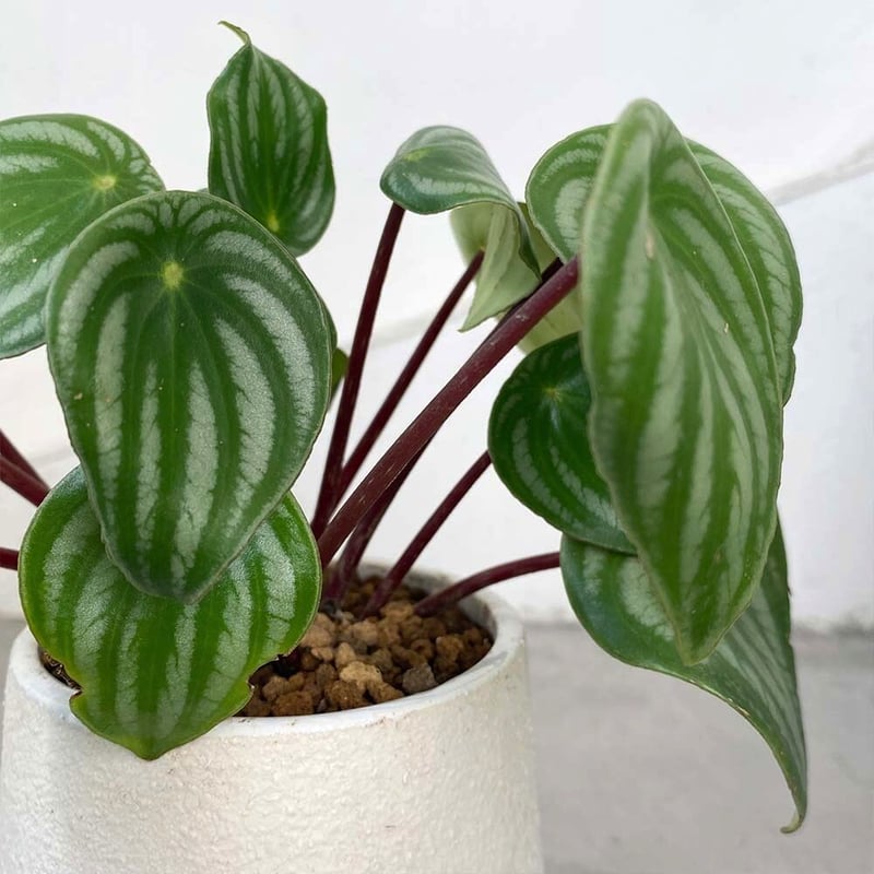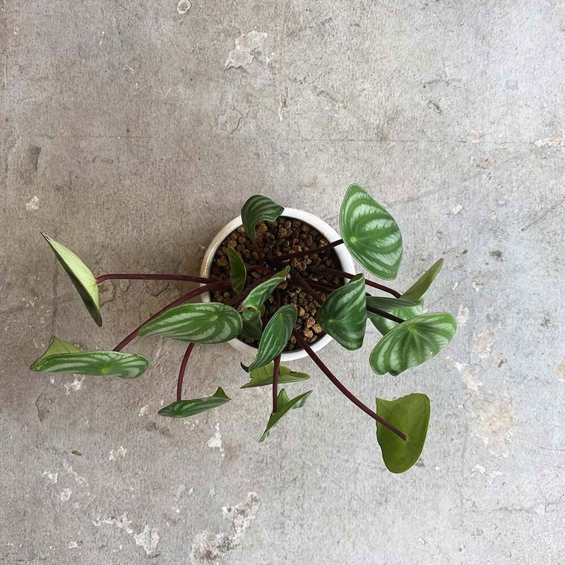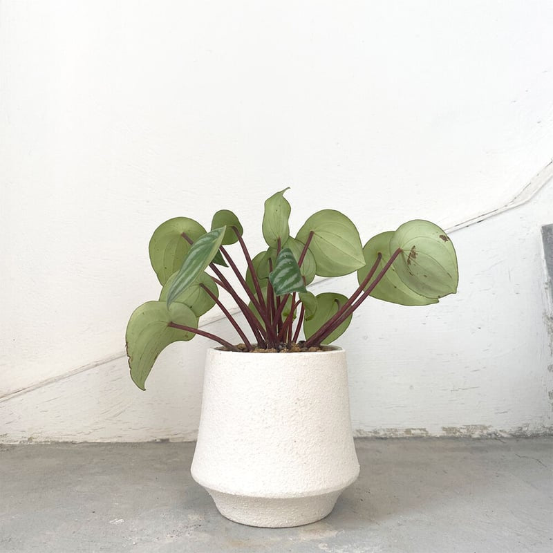 丸い葉に走る銀白の模様と赤紫の茎が静かに映える、小さな観葉植物。水やりも手がかからず、そっと置くだけで空間にみずみずしい気配を添えてくれる。植物に不慣れな人にも無理なく寄り添い、デスクや窓辺にささやかな潤いを。控えめでいて少しだけ特別な、暮らしの隅におすすめです。
