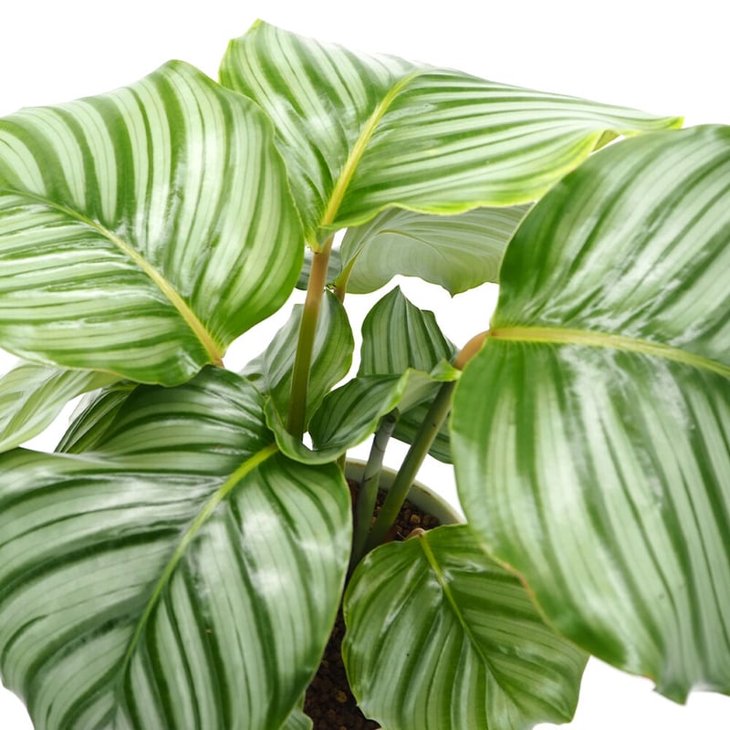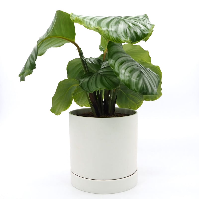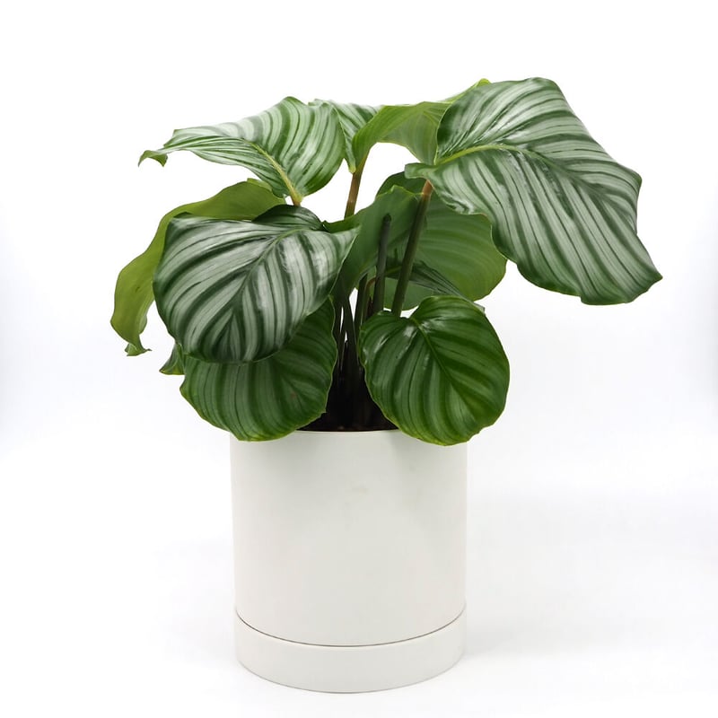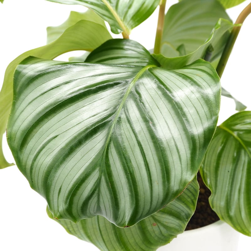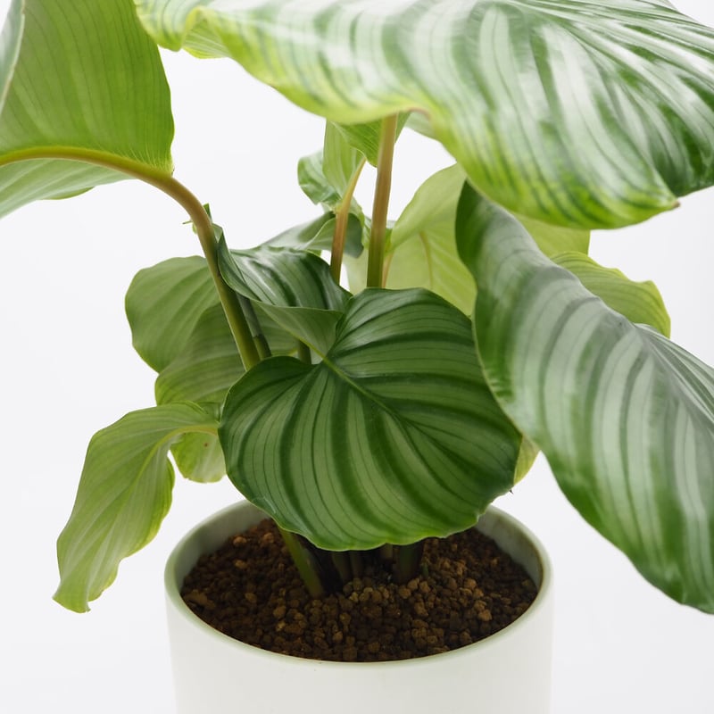 大きく丸みを帯びた葉に、やわらかなシルバーグリーンの縞模様が入るカラテア・オルビフォリア。ひと目で心奪われるような美しさを持つその葉は、インテリアグリーンとして高い人気を誇ります。