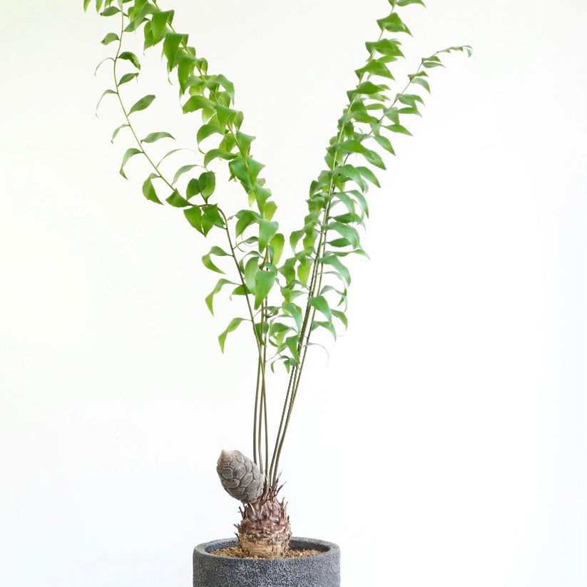 つややかに伸びる丸みを帯びた葉が、ゆったりと優美なラインを描くザミア・フィシェリ。古代植物を思わせる原始的な佇まいと、どこか繊細さも感じさせる葉姿が魅力の希少なザミアです。