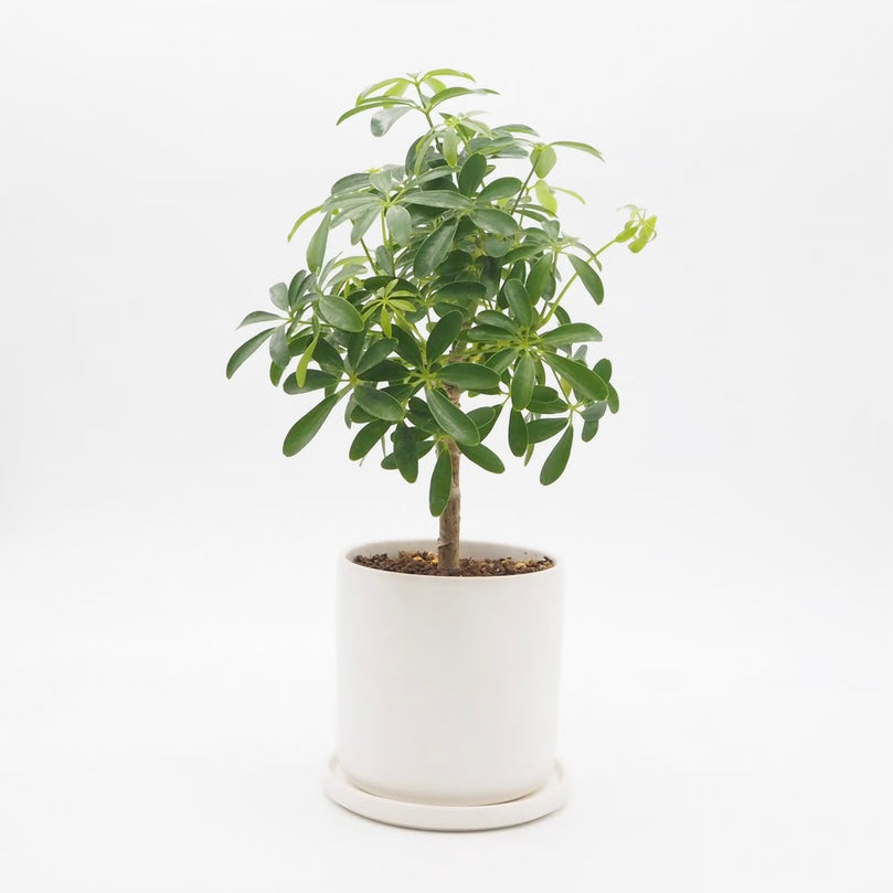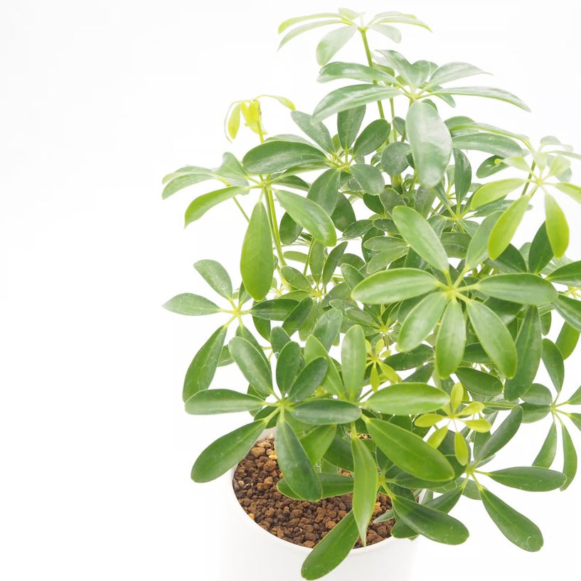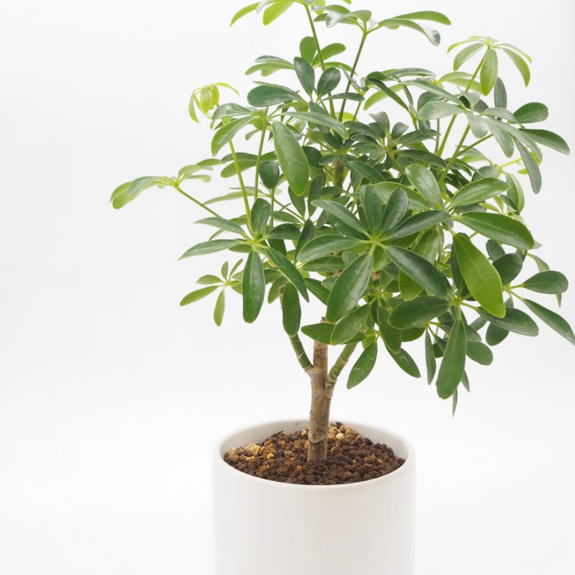 小ぶりで艶のある葉がぎゅっとまとまり、どこから見てもバランスよく整ったフォルム。シェフレラ・コンパクタは、その名の通りコンパクトで美しい樹形が魅力の植物です。