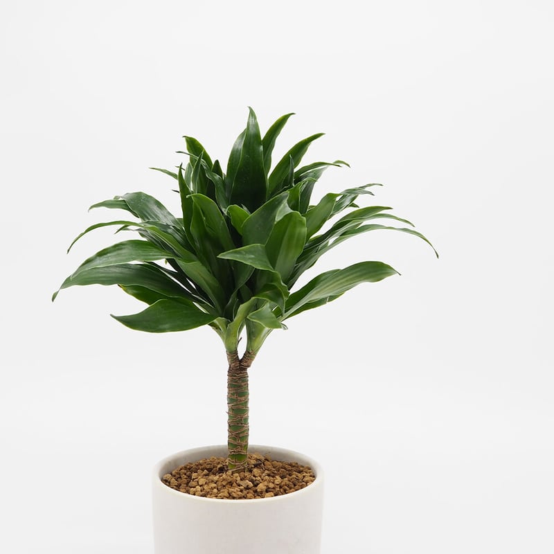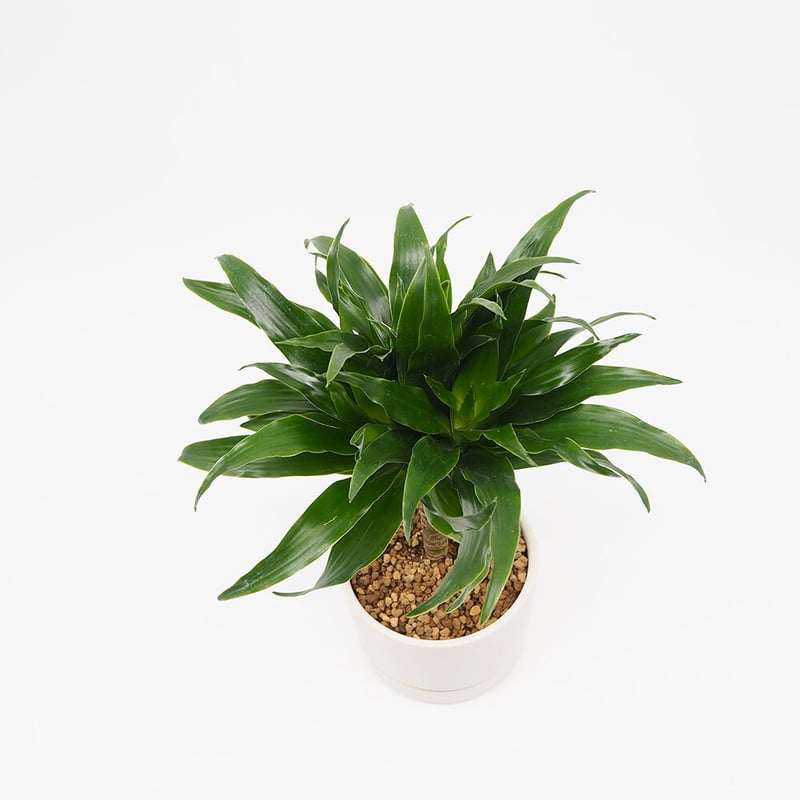 濃いグリーンの葉がぎゅっと密にまとまり、幹のまわりを包み込むように rosette 状に広がるドラセナ・コンパクタ。名前の通りコンパクトにまとまるシルエットは、洗練された印象を与え、空間に落ち着いた重厚感をもたらします。